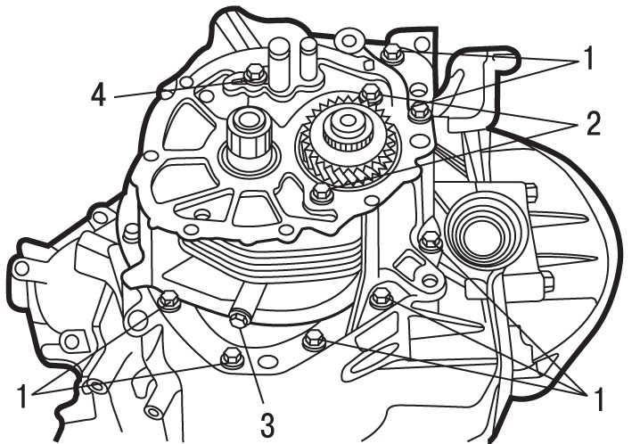 Рис. 5.31. Крепление вторичного вала: 1 — крепления картера коробки передач; 2 — стопорные болты крепления подшипника вторичного вала; 3 — оси реверсивной шестерни передачи заднего хода; 4 — крепление стопорной пластины вала вилки