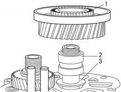 - установите упорную втулку 2 и ведущую шестерню 5-й передачи 1;