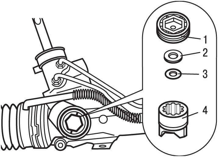 Рис. 7.16. Упор зубчатой рейки: 1 — гайка упора; 2 — шайба; 3 — резиновая проставка; 4 — толкатель с уплотнительным кольцом