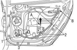 - снимите стеклоподъемник через отверстие В в задней части двери;