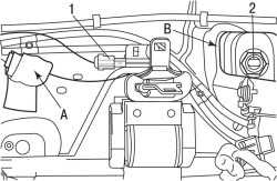 Рис. 9.61. Подсоединения и крепления антенны на крыше: 1 — электрический разъем; 2 — гайка; А — электрический разъем; В — зона около основания антенны