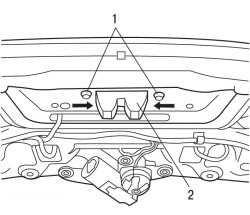 Рис. 10.33. Расположение болтов (1) и направление сжатия защелок при снятии замка (2) двери багажного отделения